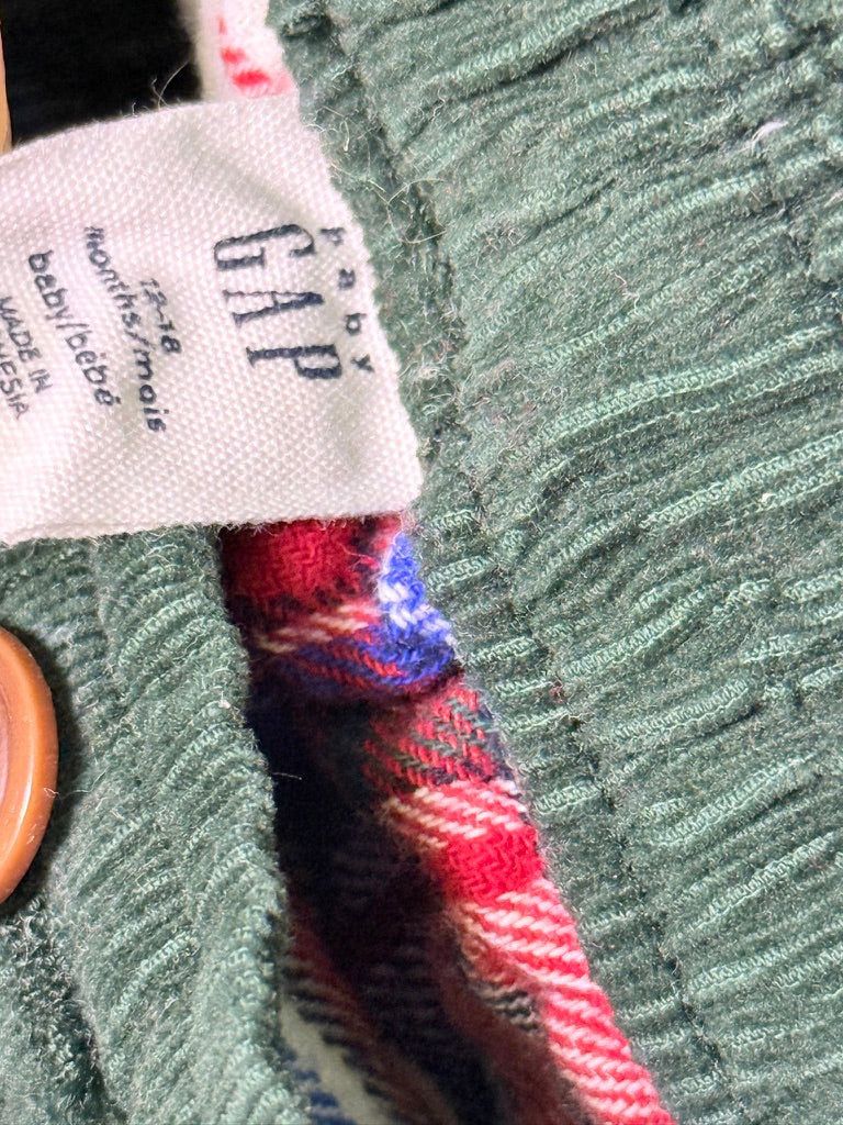 These Baby Gap corduroy pants are a cozy must-have for fall and winter. Made from soft green fine-wale corduroy, they feature a warm plaid lining that keeps little ones comfortable on cooler days. The elastic pull-on waistband makes dressing easy, while the cuffed hems with plaid detail add a classic Baby Gap look.