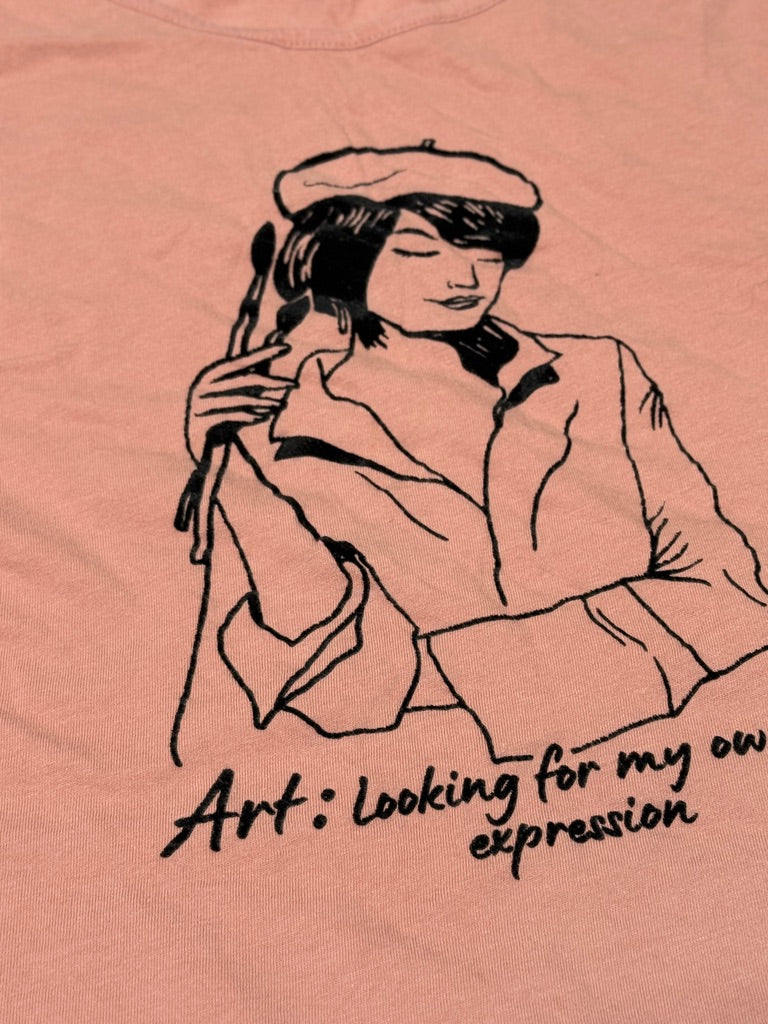 Soft and lightweight Massimo Dutti long sleeve top in a muted dusty rose tone. Features a relaxed fit with gathered cuffs and a minimalist graphic illustration on the front that reads “Art: looking for my own expression.” Easy everyday piece with a slightly elevated feel.