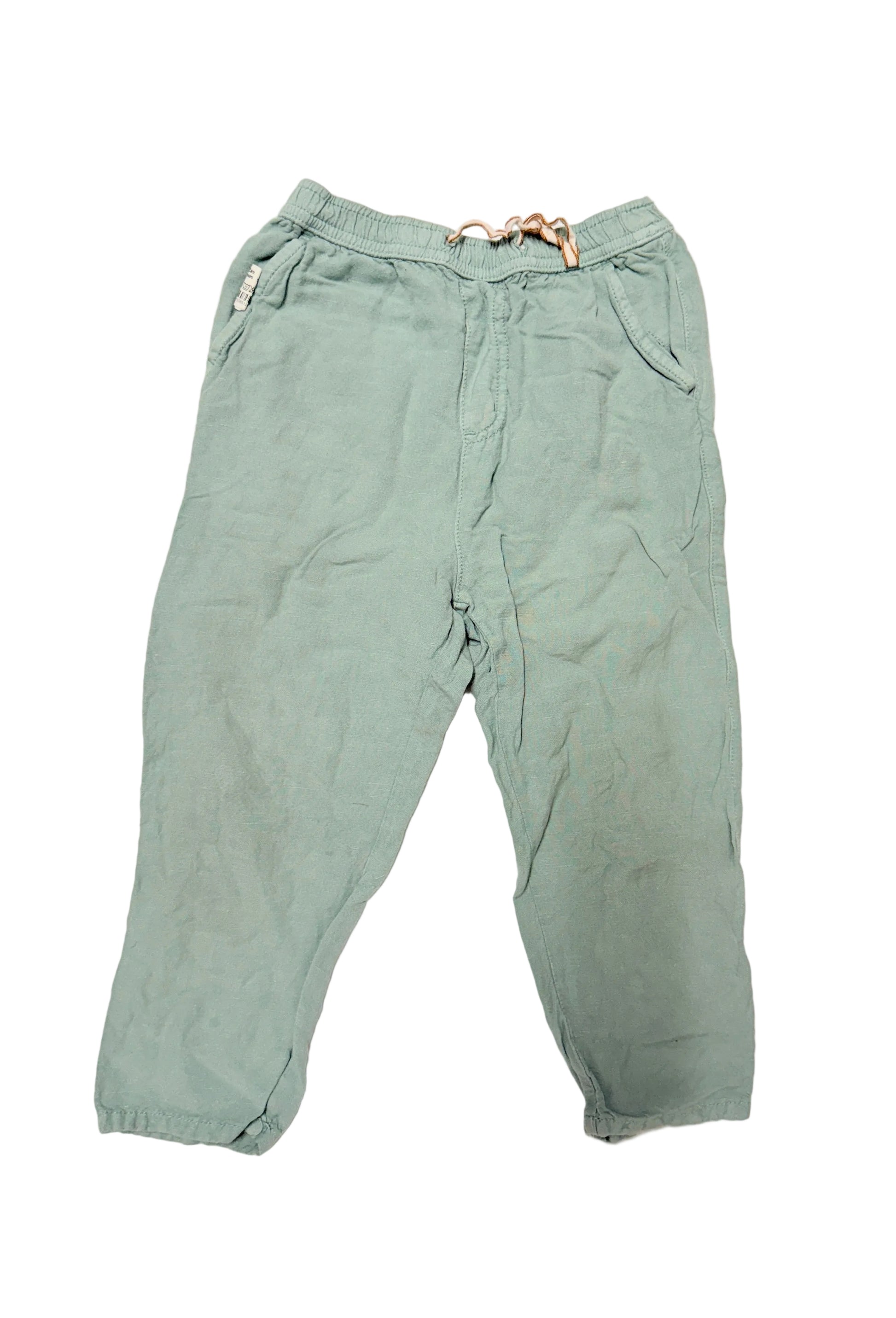 Lightweight kids pants from Zara in a soft sage green color. Features an elastic waistband with adjustable drawstring, front pockets, and a back pocket with button detail. Easy, relaxed fit that works well for everyday wear, school, or warmer weather.
